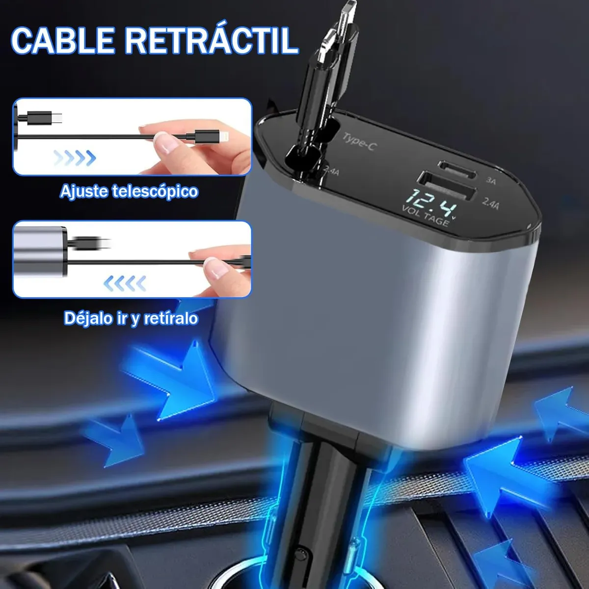 Olvídate de los cables enredados gracias a su sistema retráctil. Mantén tu vehículo ordenado y con un espacio más limpio, logrando un ambiente cómodo y moderno mientras conduces.luso en espacios abiertos o al aire libre.