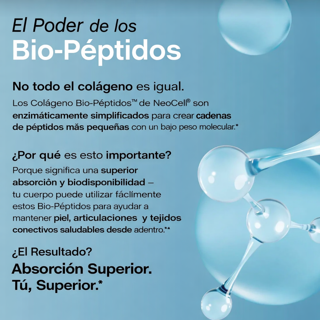 Elaborado con colágeno bovino alimentado con pasto, sin sabor y fácil de mezclar. Su proceso en Bio-Peptides™ favorece una mejor integración en tu rutina. Calidad que puedes notar en cada porción.