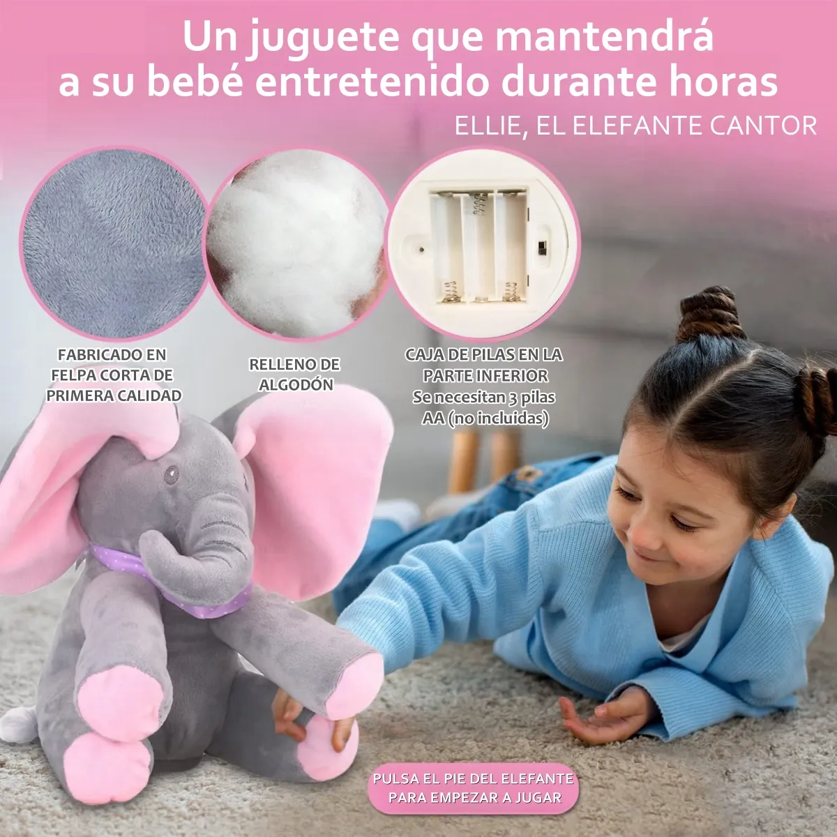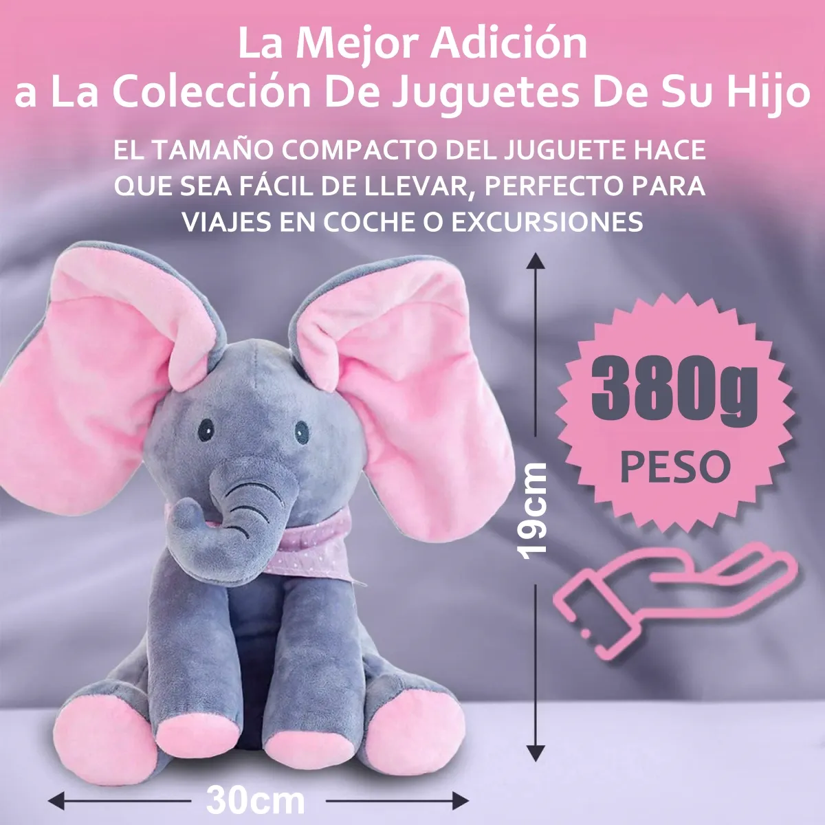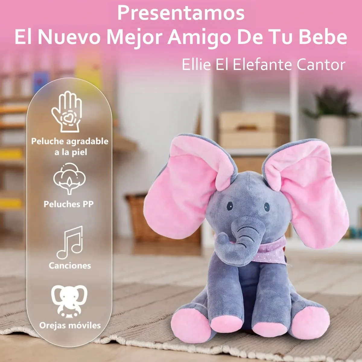 Este elefante ofrece melodías suaves que acompañan al bebé en sus momentos de tranquilidad. Su canción estimula la audición y crea un ambiente relajante. Un compañero ideal para dormir, calmar y generar rutinas positivas en casa.