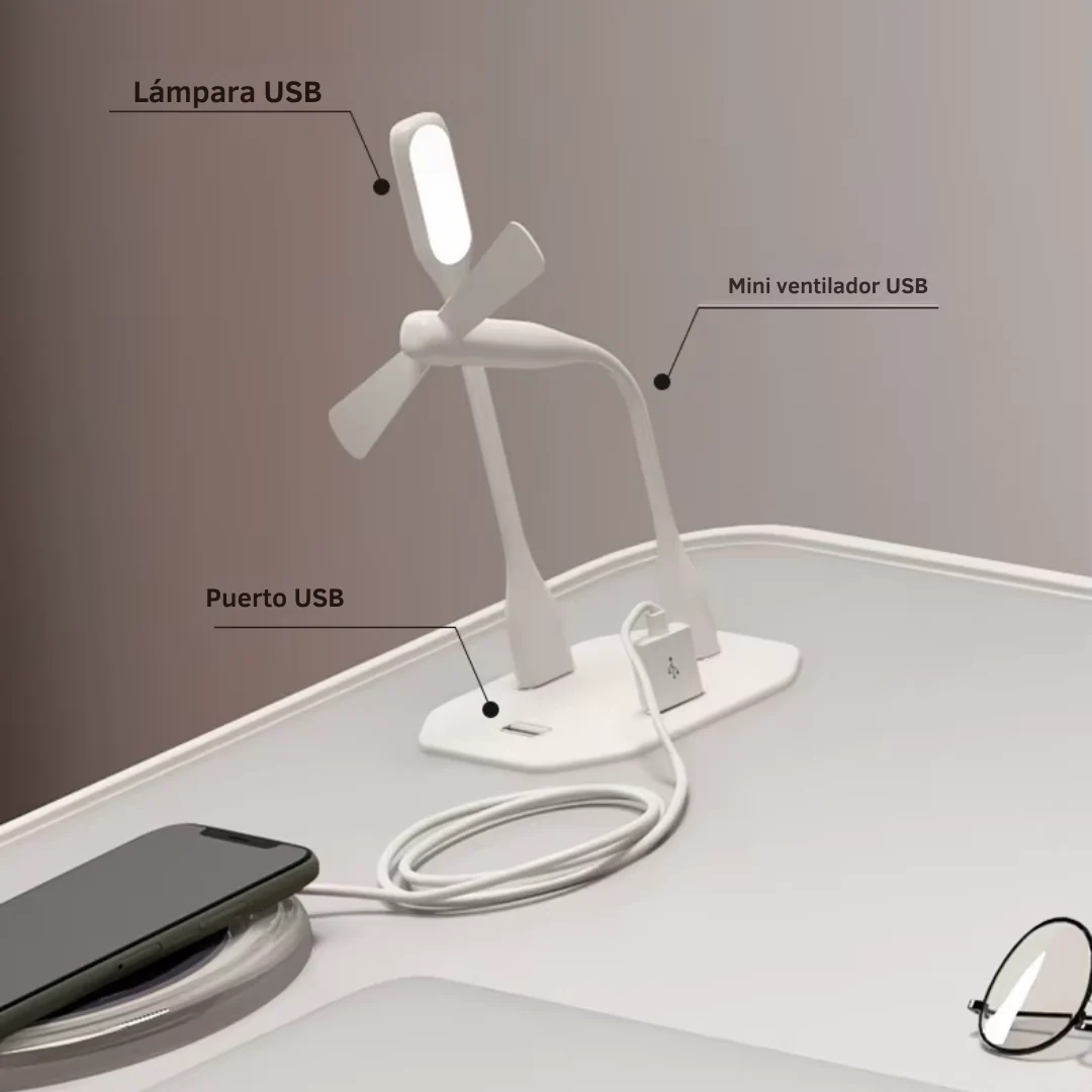 Este práctico dispositivo 2 en 1 incluye una mini lámpara con iluminación tenue perfecta para trabajar de noche y un mini ventilador USB que proporciona una brisa refrescante. Con 4 puertos USB, podrás conectar otros dispositivos mientras disfrutas de la comodidad y funcionalidad que te ofrece este compacto producto.