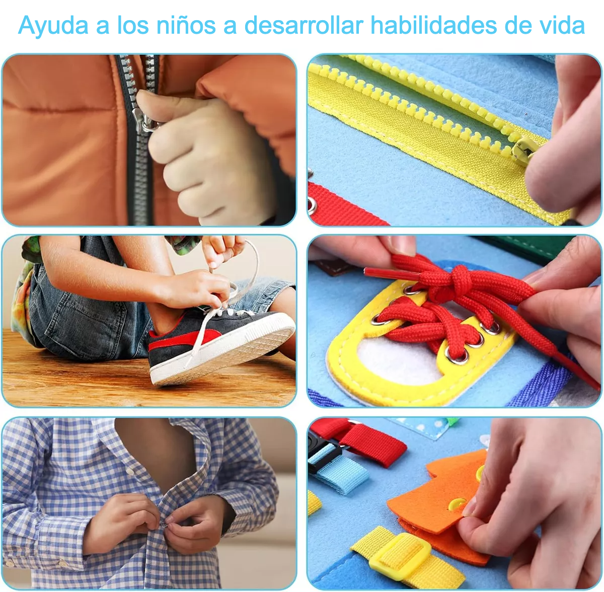 Diseñado para enseñar habilidades prácticas como abotonarse y atarse, este tablero desarrolla la coordinación mano-ojo y las habilidades motoras finas que los niños usarán a diario en su vida.